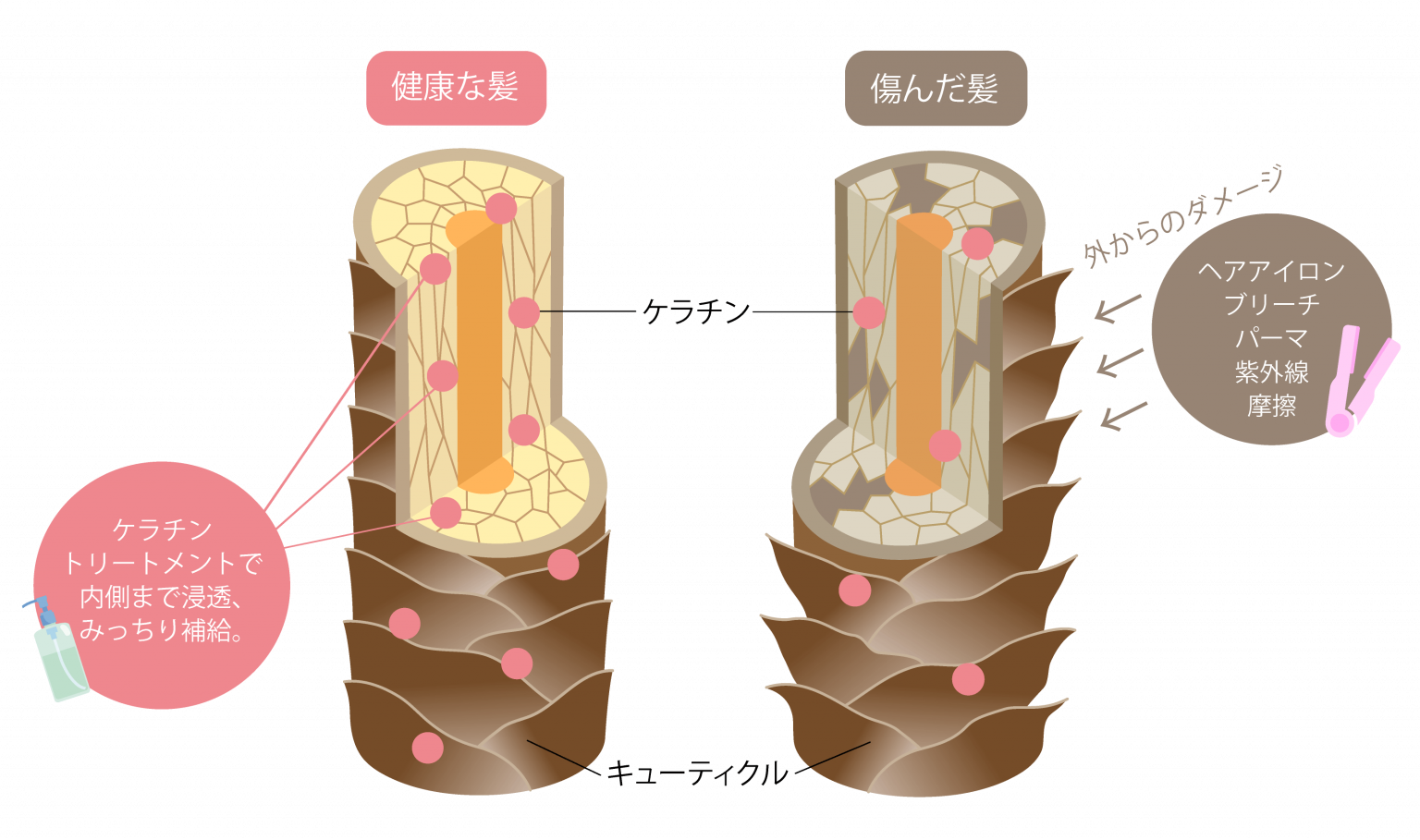 ケラチンは、髪の約90%を占めるタンパク質で、ハリ・コシ・弾力を与えます。