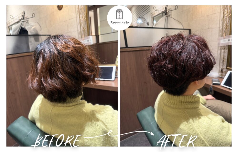 赤みのある深い色にすることで、白髪を自然にぼかせて