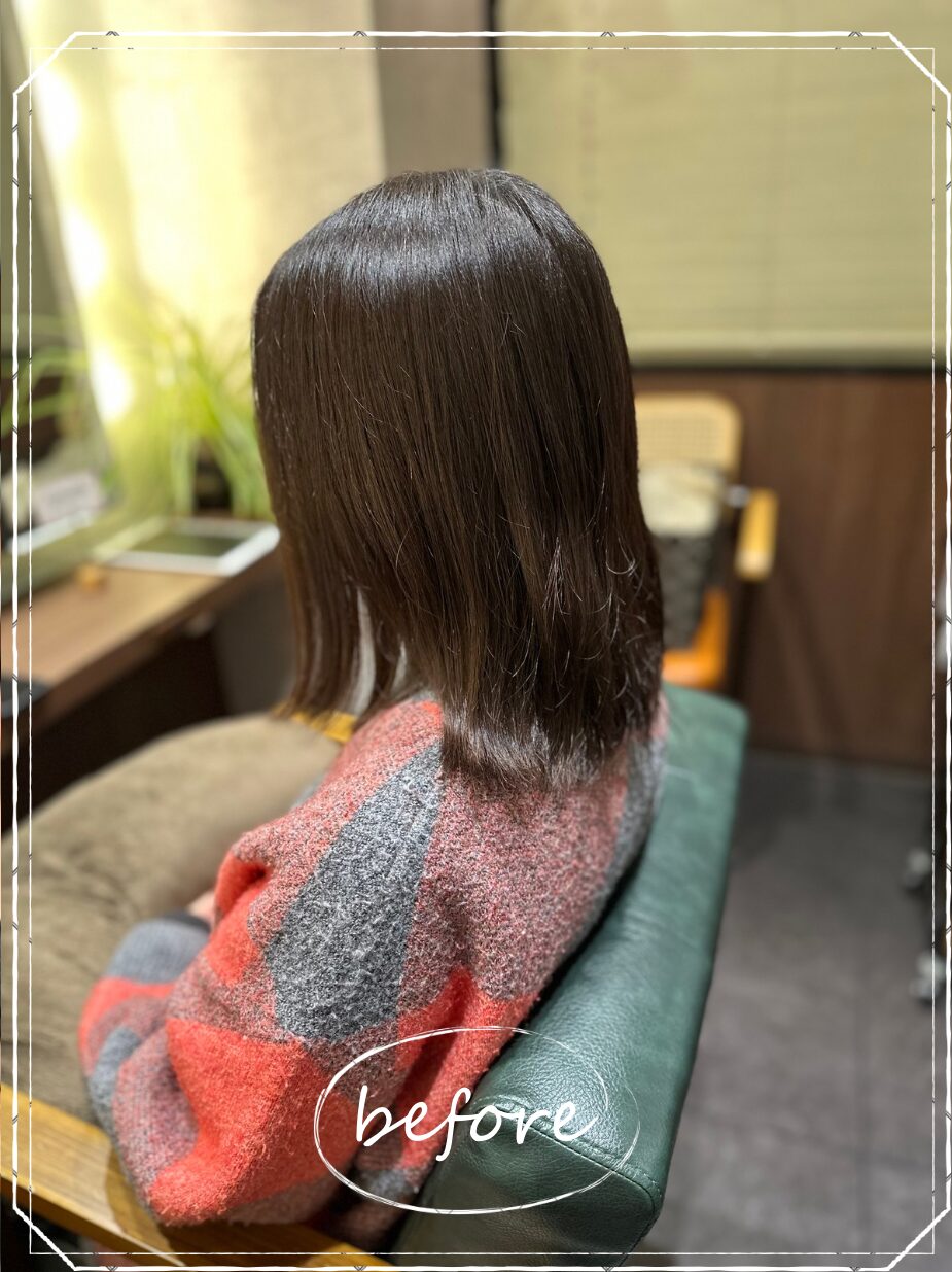 写真のBeforeを見ると、毛先が不規則に外側へ広がり、まとまりが悪く見える状態でした。