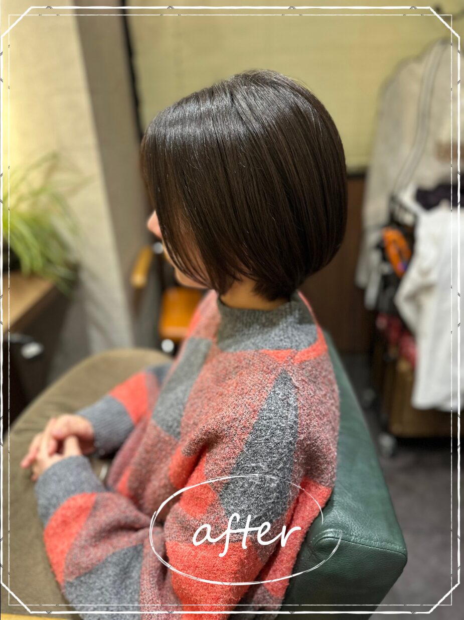 今回のお客様は「もっとスッキリしたい」「朝ラクにしたい」とのご希望だったため、思い切ってショートにして、自然なボリュームと扱いやすさを両立するスタイルをご提案しました。