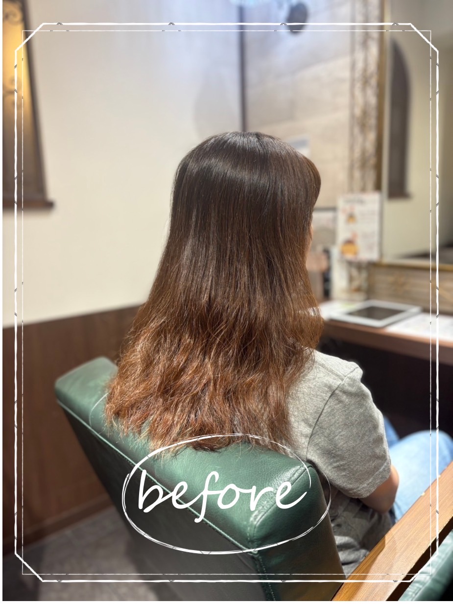 カウンセリングの結果今回は、毎回根元染めをされてたお客様のイメージチェンジを全体のお色味を暖色系に変えることで実感して頂こうと思います。