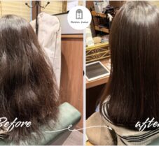 アイロンを入れて伸びた後はどうなるかの確認やその後、髪質やダメージレベルに合わせたトリートメントプランもご提案。当美容室独自のトリートメントと栄養補給を目的とした製品を使用し、施術を経て髪の内部から修復を促しました。