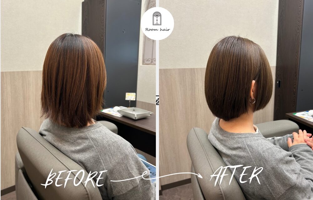Afterでは、毛先の長さをしっかりカットし、コンパクトなボブスタイルに。