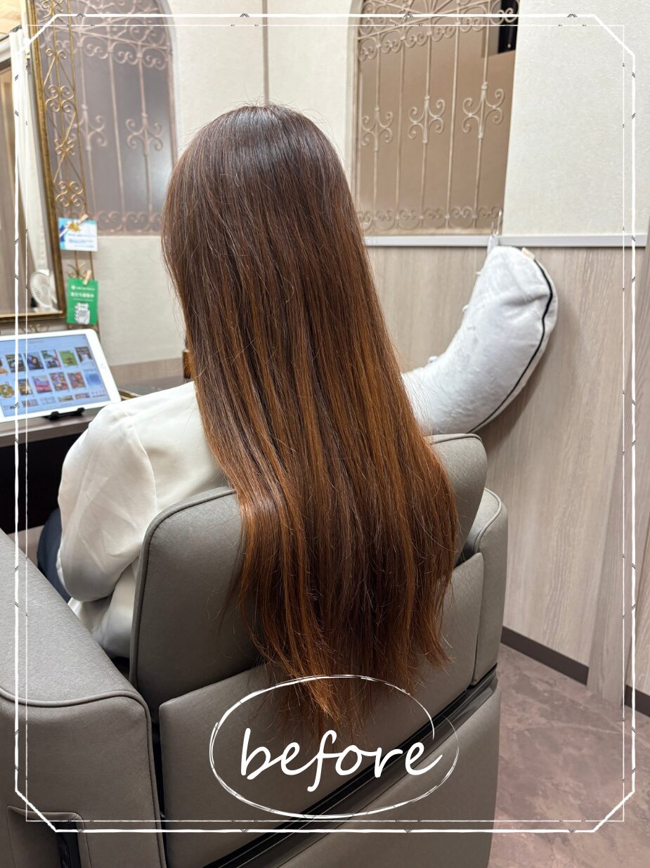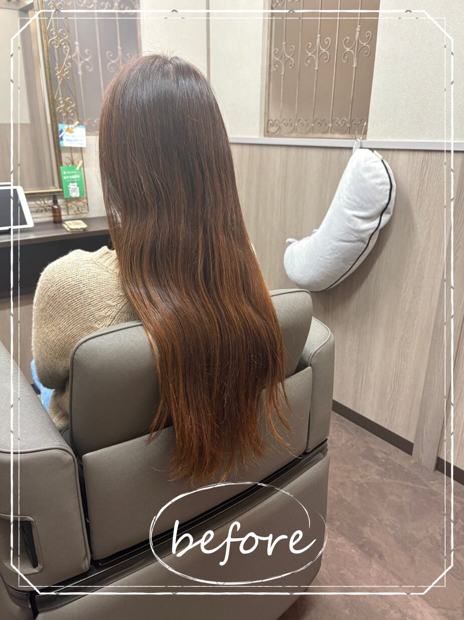 普段から広がりやすい・乾燥しやすい髪質にお悩みとのこと。特に「朝まとまらない」「毎日ストレートアイロンが手放せない」とのご相談でした。カラー履歴もあり、毛先には少しダメージが残っている状態。