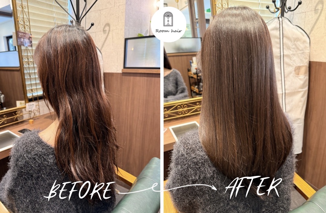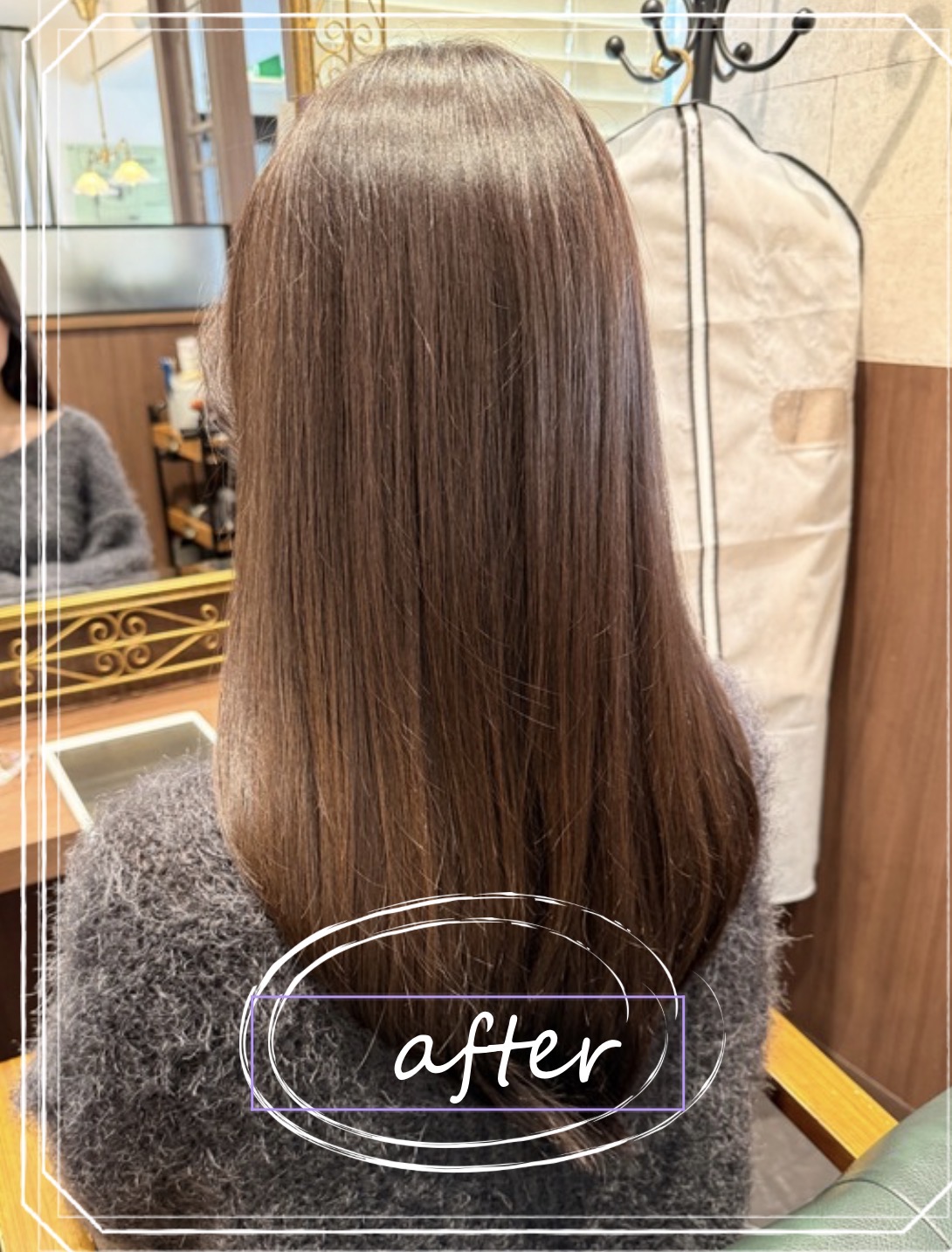→ ダメージを抑えつつ、ツヤ感が引き立つカラーを選定。 - 髪質改善トリートメント