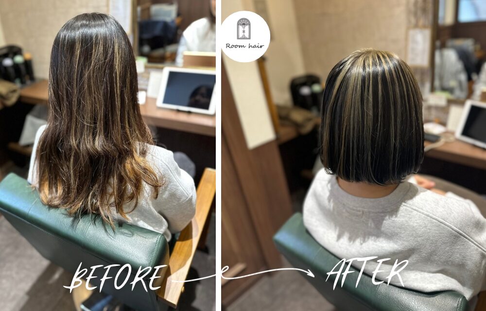 カラーをする前に荒切りをして、ボブスタイルになるように量感とラインを調整しました。